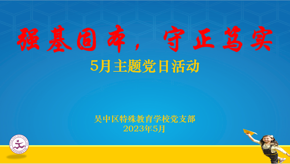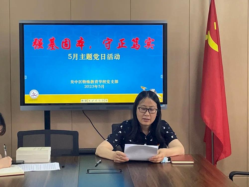 为持续深入推进学习贯彻习近平新时代中国特色社会主义思想主题教育,激励广大党员干部师生坚定理想信念、凝聚干事创业力量,吴中区特殊教育学校党支部于2023年5月29日开展“强基固本,守正笃实”主题党日活动,会议由赵雪蕾委员主持。